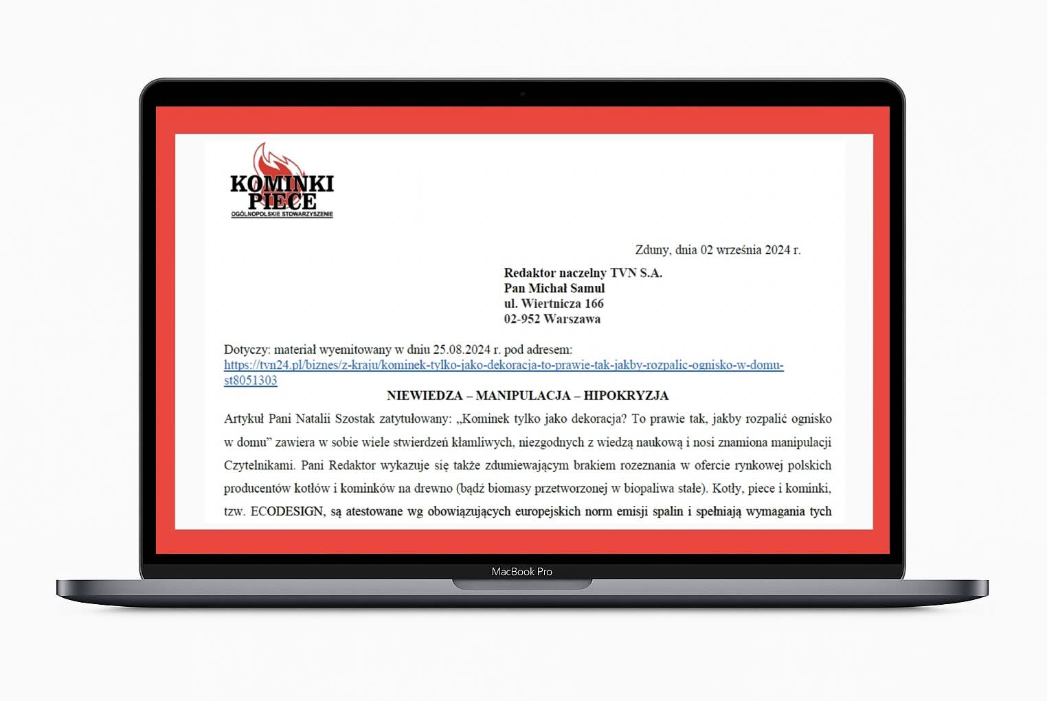 poniżej publikujemy list wysłany przez Ogólnopolskie Stowarzyszenie Kominki i Piece do biura TVN24 w odpowiedzi na materiał wyemitowany w dniu 25.08.2024 r. – link do materiału TVN.