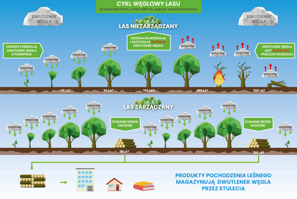- Las zarządzany to system w równowadze. Gdy drzewa osiągają dojrzałość, są planowo ścinane, a na ich miejscu sadzone są młode sadzonki, które ponownie intensywnie pochłaniają CO₂.